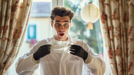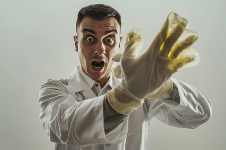 Surprised scientist in lab coat putting on protective gloves with exaggerated expression.