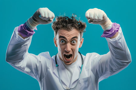 Excited scientist in lab coat expressing enthusiasm on turquoise background.