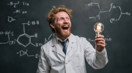 A joyful scientist in a lab coat holds a glowing light bulb while surrounded by chemistry formulas on a chalkboard, embodying joy in scientific discovery.