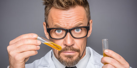 A serious scientist in a lab coat is holding two test tubes with yellow liquid. The focused expression captures the essence of scientific research in a studio setting.