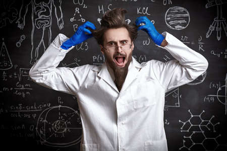 A professor obsessed with his idea pulls out hair on his head and screams madly standing by a blackboard with formulas and theories.