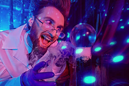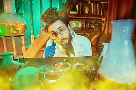 Mad scientist looks through a magnifying glass and is surprised while standing in his laboratory in green and red light.