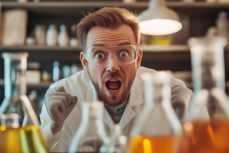 Surprised scientist looking at successful experiment result in laboratory, celebrating breakthrough in research