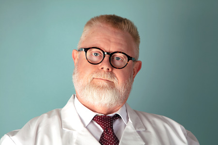 Scientist in lab coat and eyeglasses standing in his laboratory