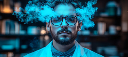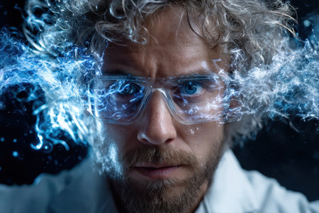 A scientist focused on experiments in a lab displays electric energy around his head, showing brilliance.
