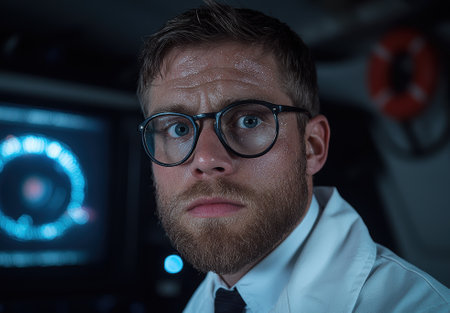 A scientist with disheveled hair shows surprise in a dramatic studio portrait.