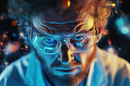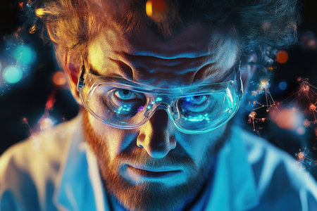 A scientist focuses intently on his work, surrounded by shimmering particles while wearing protective glasses.