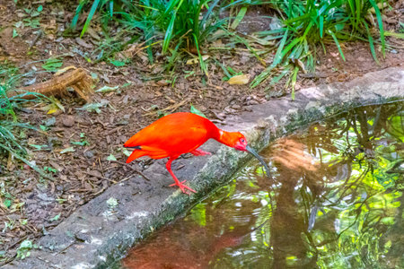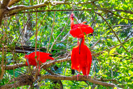 Scarlet Ibis red bird birds in tropical nature rainforest jungle and park in Foz do Iguacu State of Parana Brazil.