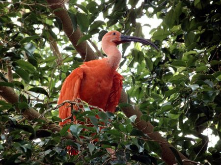 Scarlet ibis sitting on a branch in a zoo