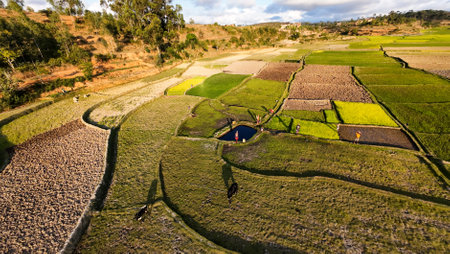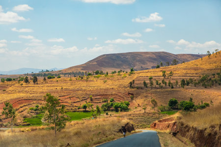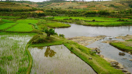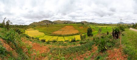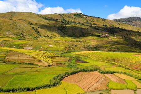 Typical Madagascar landscape - green and yellow rice terrace fields on small hills in region near Vohiposa along main road. green grass and bright ocher soil