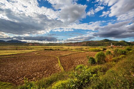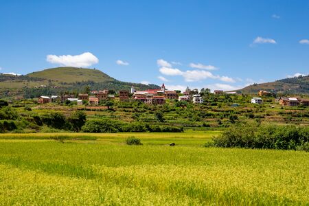 Landscape with rice fields in central Madagascar on a sunny day