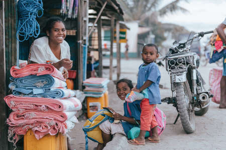 MAROANTSETRA, MADAGASCAR OCTOBER 20.2016: Smiling Malagasy woman with children sells on the street Maroantsetry bags. October 19. 2016, Madagascar