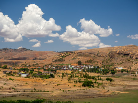 Landscape of Madagascar central highlands with small town in the valley