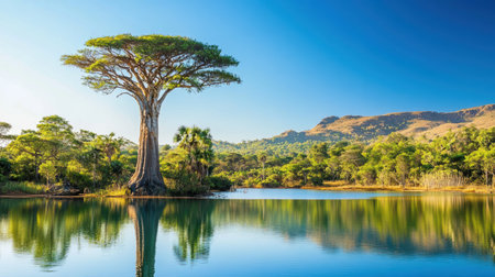 Arafed tree stands alone in a serene lake with a majestic mountain backdrop,.