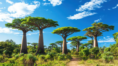 Baobab tree with green leaves among the lush green small trees. Madagascar
