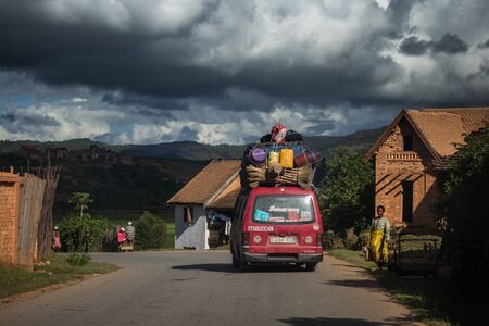 FIANARANTSOA / MADAGASCAR - 23 DECEMBER 2013: Loaded African bus moves on the paved road and passes villagers with mountains on the background