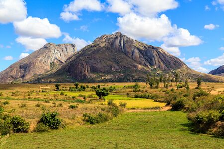 A landscape pictures of the country of Madagascar, with mountains and meadows