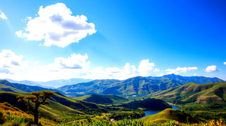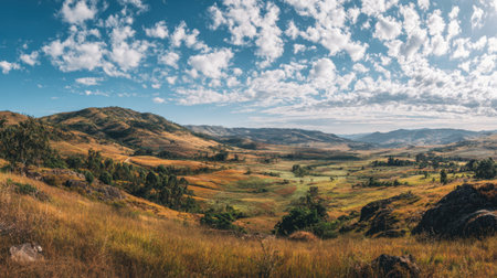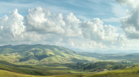 A stunning panoramic view showcasing a tranquil landscape with rolling hills, vibrant valleys, and fluffy clouds under a clear blue sky. Perfect for nature enthusiasts.