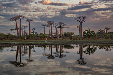 The famous alley of baobabs at sunset. A row of trees with compact crowns against the blue-red evening sky. The sun is shining from behind the trunk. In the foreground is a pond