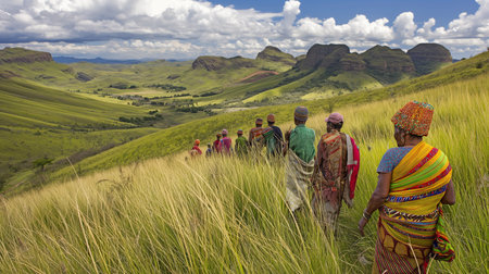 Rolling hills covered in lush greenery stretch across the landscape illuminated by bright sunlight. Gentle clouds drift in the blue sky creating a picturesque scene of nature.