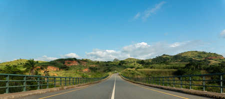 A road-bridge surrounded by hills and greenery over the Keve River in Angola