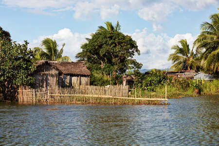 Madagascar traditional rural landscape with fisherman hut in Tamatave province near Maroantsetra city. Countriside wilderness virgin natural scene in North eastern Madagascar