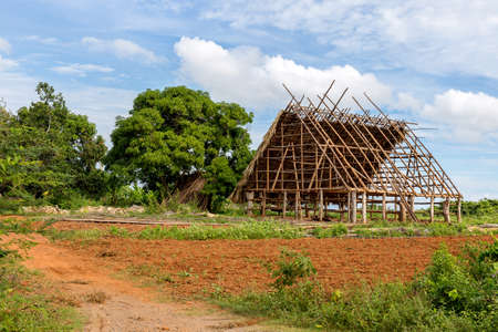 Traditional wooden african malagasy hut with roof from straw, typical village in north west Madagascar. Madagascar landscape.