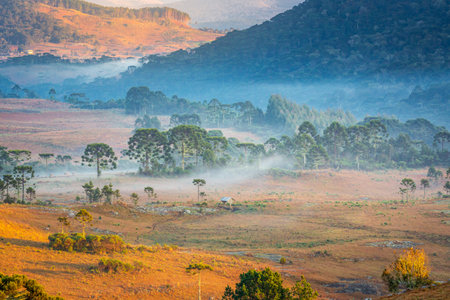 Southern Brazil countryside and Araucaria conifer landscape at peaceful sunrise