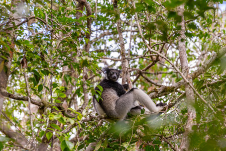 A Portrait of the Indri lemurs in a rainforest in Madagascar