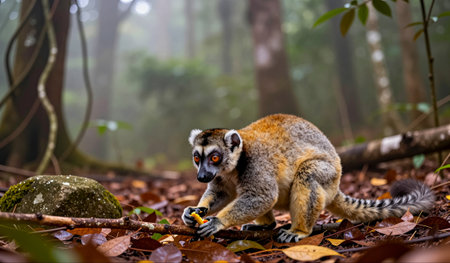 A playful lemur creeps through fallen leaves, its bright eyes scanning the surroundings. Mist filters through trees, creating an enchanting atmosphere in a tranquil forest.