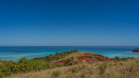 Beautiful seascape. Thick yellowed grass grows in the valley. Green trees on a red soil hill. A tiny rocky islet is visible in the aquamarine-turquoise ocean. Clear blue sky.