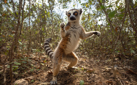 A ring-tailed lemur is captured mid-action, standing on two legs. The animal displays a mix of tan, white, and black fur. The scene features natural lighting and a backdrop of dense foliage, suggesting an outdoor environment. This image could be suitable for various commercial and editorial applications.