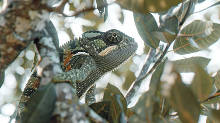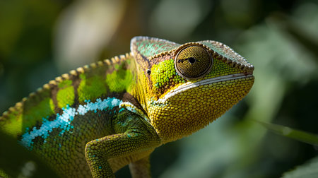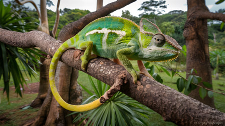 a vibrant chameleon perches on a branch, its skin a mix of green and yellow, blending with nature