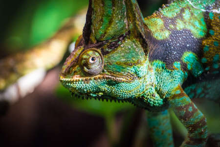 African rainforest veiled chameleon looking close up from branch