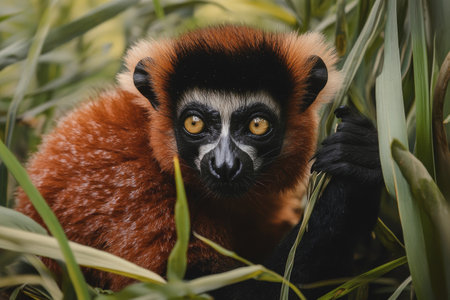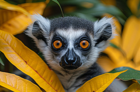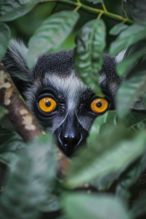 Golden-eyed lemur peers through dense jungle leaves, its inquisitive gaze highlighted by the verdant natural frame, embodying a blend of curiosity and intelligence in its serene habitat, perfect for wildlife and nature enthusiasts.