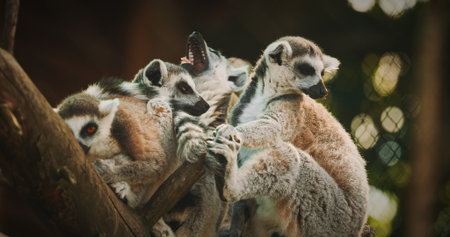 Group of playful lemurs enjoying sunny day outdoors.