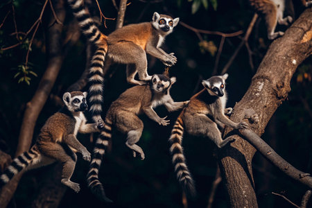 Ring-tailed Lemurs in a rainforest canopy at dusk