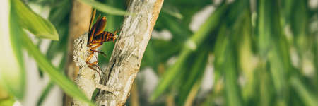 BANNER Macro close-up photo captures moment big gray lizard eat devourie prey swallow still fluttering brown beetle cockroach sit on branch. Green bright nature background. Life struggle, ecosystem
