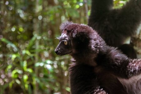 A Portrait of the Indri lemurs in a rainforest in Madagascar