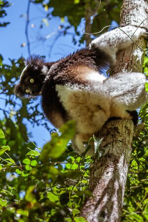 Black and white Lemur Indri (Indri indri), also called the babakoto, hanged on tree. Indri is the largest living lemur. Andasibe - Analamazaotra National Park, Madagascar wildlife