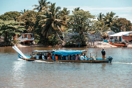 MADAGASCAR OCTOBER 18.2016 Malagasy village people transport freight by overloaded and crowded taxi boat. Daily life on the river. Maroantsetra October 18. 2016, Madagascar.