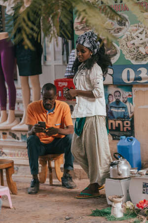 Aksum, Ethiopia - April 27, 2019: Ethiopian traditional Coffee maker, local women preparing bunna cafe behind Aksum KIdist Maryam Hospital, Ethiopia, Africa