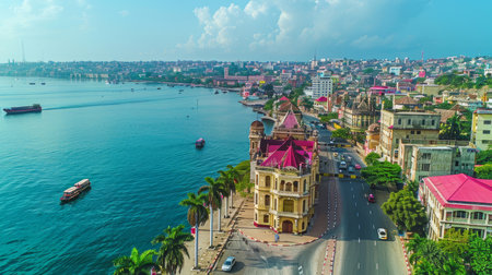 This vibrant aerial image captures Dar es Salaam's scenic waterfront showcasing unique architecture, busy streets, palm trees, and boats on the harbor.
