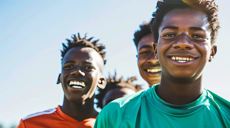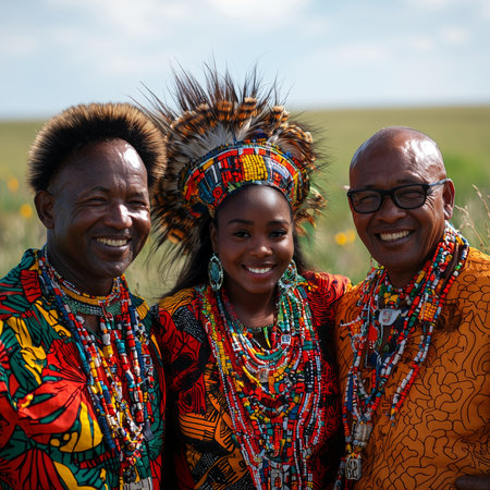 A group of three friends dressed in vibrant traditional African clothing and beadwork, joyfully smiling while outdoors on a sunny day, symbolizing unity, happiness, and cultural appreciation.
