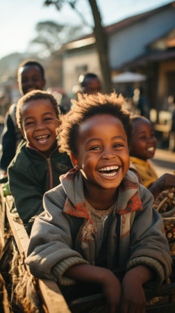 Three cheerful African children are playing outside under a bright blue sky. They are laughing and appear to be having fun.