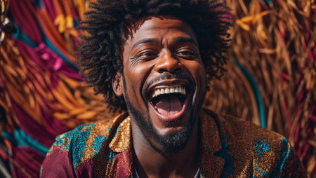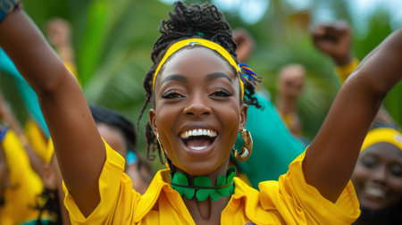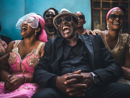 A cheerful group of people in culturally vibrant attire against a colorful backdrop. The scene conveys unity, friendship, and cultural identity, with bright yellow patterns symbolizing community and joy.