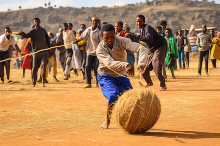 Stone Town, Zanzibar, Tanzania - January 2021: Crowds of people watch like young people jump on an inner tube on a sandy beach in Stone Town. Africa