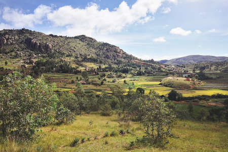 Typical Madagascar landscape in region near Tsiafahy, small hills covered with green grass and bushes, red clay houses and rice fields near.