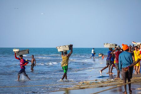 TANJI, THE GAMBIA - NOVEMBER 21, 2019: Scene with men and women carrying fish from the boats to the beach on Tanji, Gambia, West Africa.