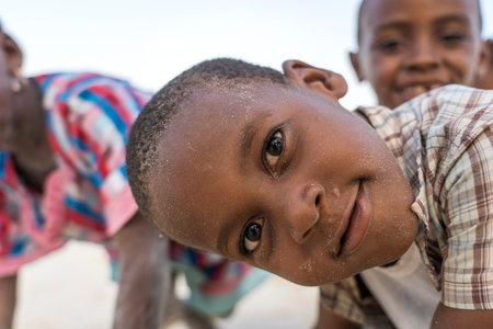 Zanzibar, Tanzania - january 15, 2020: Young African children on a tropical beach near sea on the island of Zanzibar, Tanzania, east Africa, close up